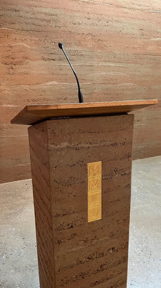 → In die Altarwand, ebenfalls aus gestampftem Lehm, wurden bewusst Furchen eingearbeitet, die symbolisch für die Spuren des Lebens stehen.